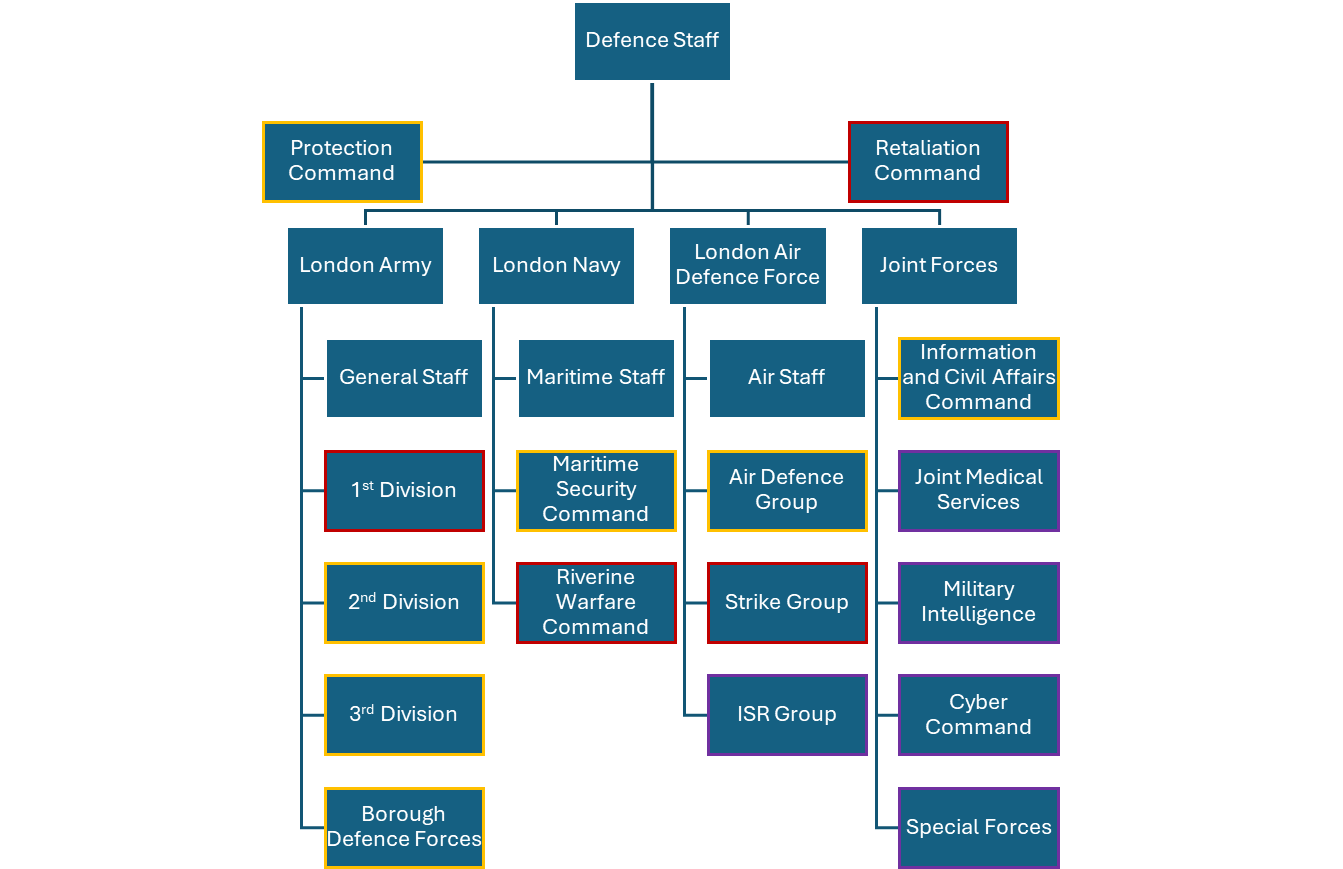 London’s Defence Forces (LDF) would broadly fall into two separate joint task forces, each aligned to Pillars 2 and 3 of the defence strategy. The first would focus on the territorial defence of London itself – what I am going to call ‘Protection Command’ – and the second would focus on aggressively taking the fight to the adversary – ‘Retaliation Command’.