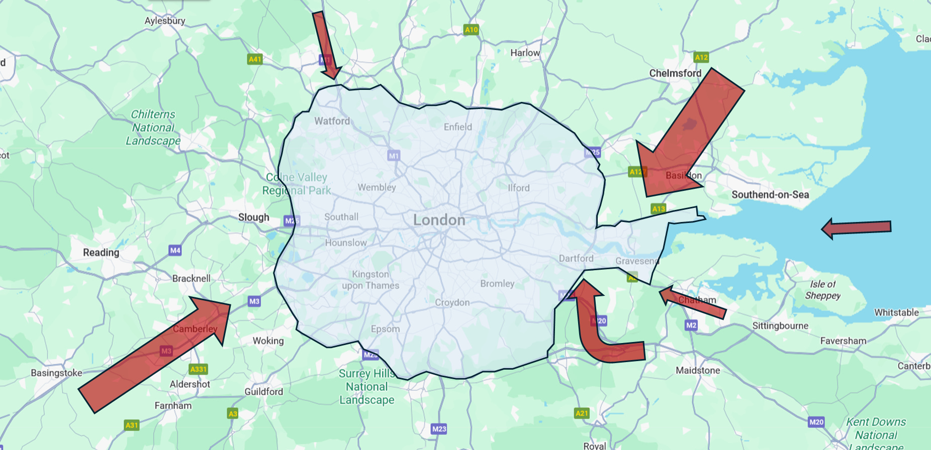 London’s primary strategic concerns are that it is surrounded on almost all sides by an unfriendly nation, and that it is dependent on that nation for much of its food, power, and utilities. To cap it off, London has very little strategic depth – i.e. England is right on its doorstep and there is no buffer zone of land over which a hostile force might overstretch itself. England’s primary military encampments for its armoured force on Salisbury plain are only about two hours’ drive from the centre of London. Finally, London’s connection to the outside world is through the Thames Estuary: continued access to this waterway is critical and must be protected at all costs.